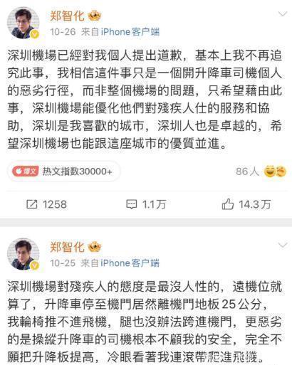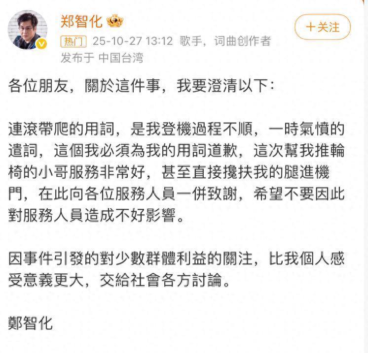 10月27日,郑智化在社交媒体上第三次回应了机场“连滚带爬”事件,这次回应是出来道歉的,他在27日下午一点多的时候发文道歉,表示自己第一次控诉的时候用词不当,洋洋洒洒写了一篇道歉的小作文。